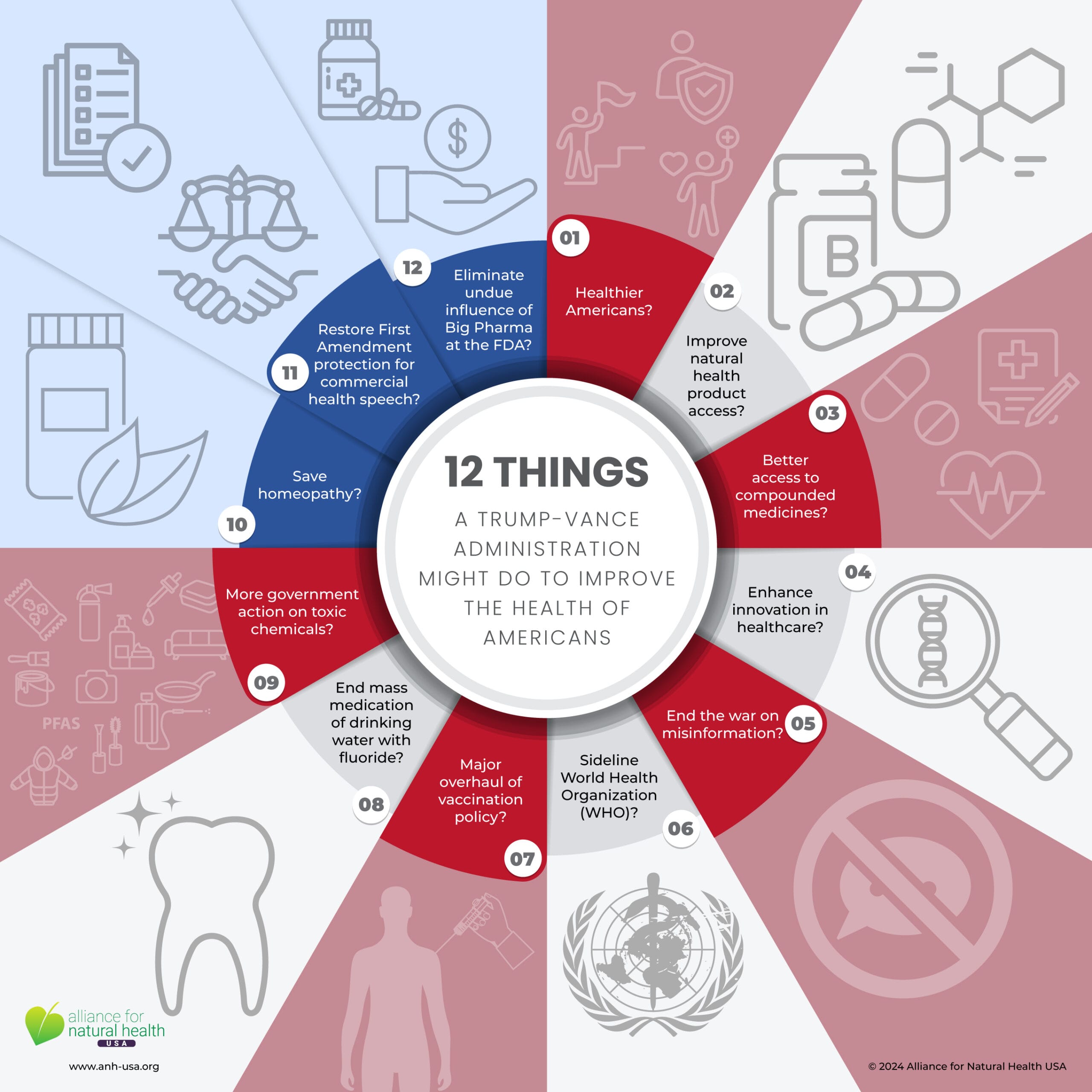Para que quede claro: la ANH es una organización no partidista centrada en su misión, dedicada a proteger y promover el acceso a las opciones de salud natural y a la información sobre esas opciones. Es nuestro deber buscar las oportunidades para avanzar en esos objetivos, independientemente de quién resulte elegido. A continuación encontrará un desglose por temas de las oportunidades que hemos identificado hasta ahora para promover los intereses de los defensores de la salud natural y los consumidores.