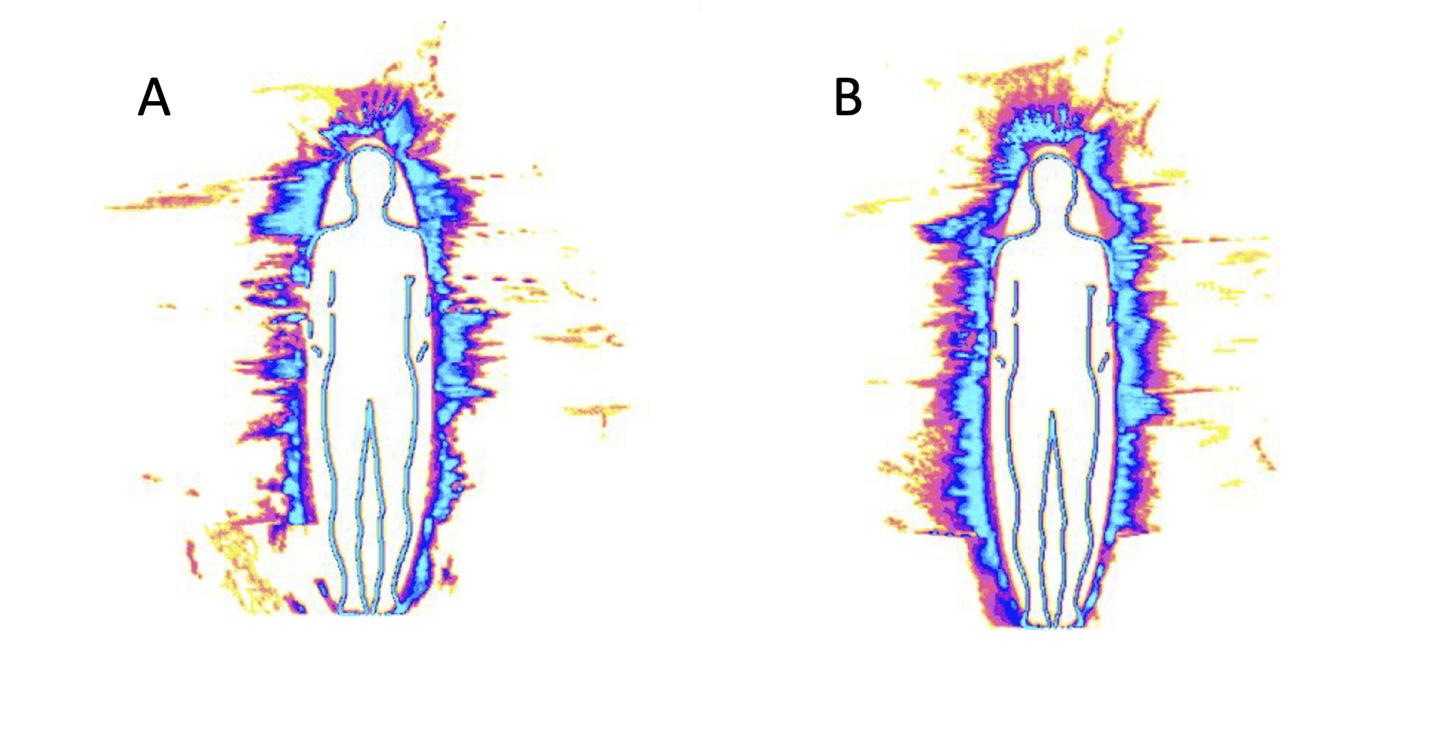 Figura 3. Composite aura for normal healthy female (50) before (A) and after (B) administering therapeutic touch therapy. Image from part of a range of studies undertaken by Dr Konstantin Korotkov as summarised in a book chapter by Beverley Rubik PhD of the Institute for Frontier Science (Oakland, California).